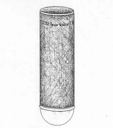 The bomb consists of an aluminum painted metal cylinder 2 inches in diameter and with an overall height of 5.8 inches. A red label is glued to the cylinder and gives the di-rection for use of the incendiary. The wooden container is an unpainted block of wood with a hole drilled in it just large enough for the bomb; the container measures 2.5 x 2.5 x 7.2 inches. |
