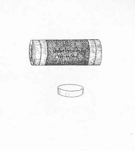 The "Rauchstein" type consists of a solid smoke mixture tightly packed in a paper wrapping and measuring 2 inches in diameter and 2.2 inches high. The "Nebelsteine" type are illustrated on the opposite page. They consists of white discs 0.4 inches thick and 1.8 inches in diameter and are packed in "tens" in transparent orange paper; the label is inside this wrapping. |