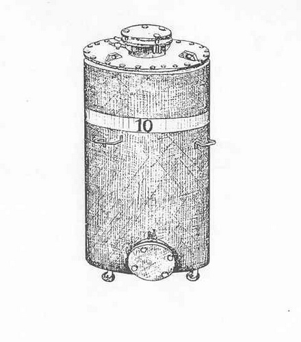 This canister has the same outer dimensions as the Canister, Gas-Smoke, GS-10, item IV–B–17, and is constructed in a similar manner. It consists of a tall cylinder mounted in caster wheels and fitted with a flanged opening at the top, one on the side and one on the bottom. When the canister is not in use, these openings are covered by steel discs, fastened by bolts. |