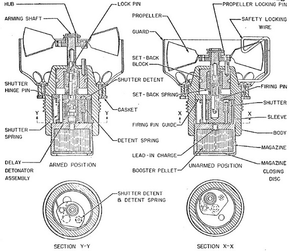 1. The arming shaft which mount the propeller is attached to the firing pin by means of a locking pin. The purpose of the locking pin (which may be sheared upon impact) is to prevent the firing pin from being forced too deeply into the shutter thus disrupting the delay element on heavy impact. |