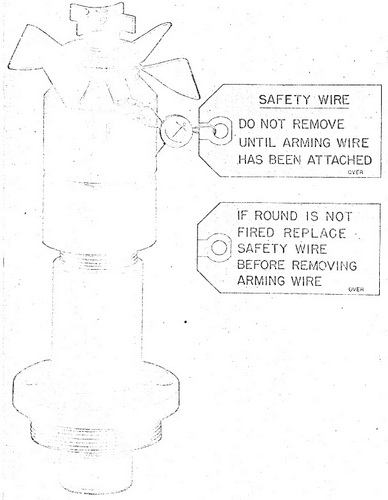 Attached to the body is an arming wire guide. Until such time as the fuze is used a safety wire, passed through a hole in the propeller and through this guide, prevents the propeller from turning. On the launcher an arming wire is used in place of the safety wire. |