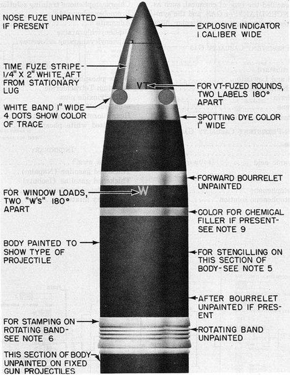 Time fuze stripe: Projectiles having a nose time fuze shall have a ¼-inch white stripe painted longitudinally from the stationary lug on the fuze two inches aft. |