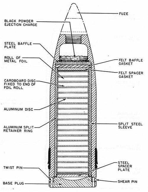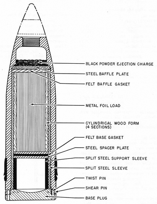 Window Load Mk 1 Mod 1: Consists of about 13,800 aluminum foil strips, each 8 in-ches long, 3/16 inch wide, and 0.00025 inch thick, backed on either side by 12 pounds of tissue paper, solid glued. The strips are stacked within four-section cylindrical wood form, which is encases in a split steel sleeve, the whole inserted into the projectile ca-vity. |