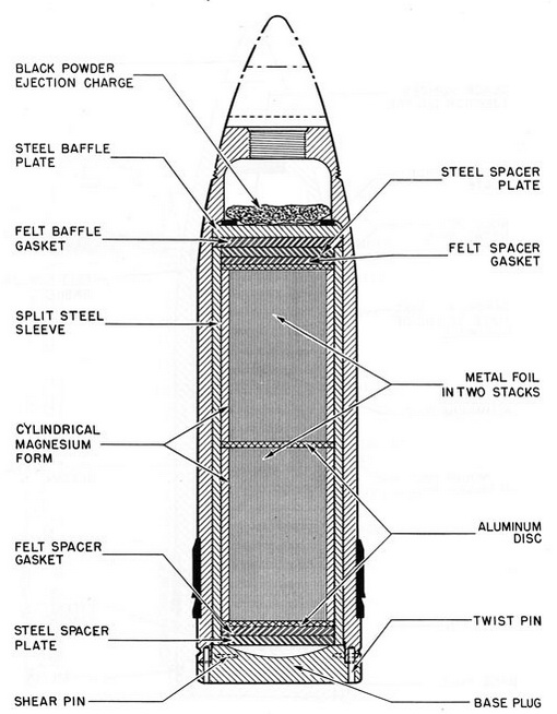 Operation: The explosion of the black powder ejection charge, initiated by the fuze, exerts a pressue against the baffle plate and forces the split steel sleeve, window load, and base plug out of the base end of the projectile. |
