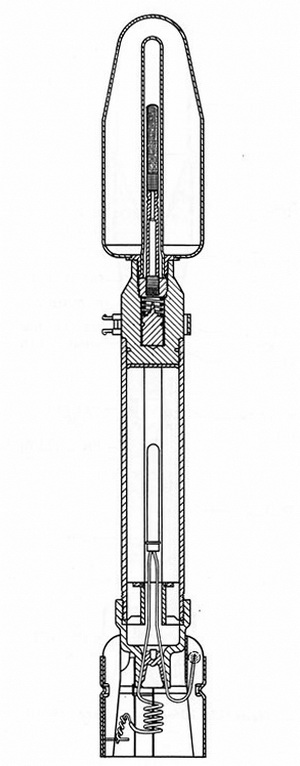 The head assembly consists of a container for the smoke charge with a long burster well containing PETN inserted from its after end. A collar is soldered to the base of the container. The space slips over the threads of the collar and is held against the flat sur-faces of the collar by the fuze body, forming a joint between the two. The primer holder is threaded into the fuze body. |