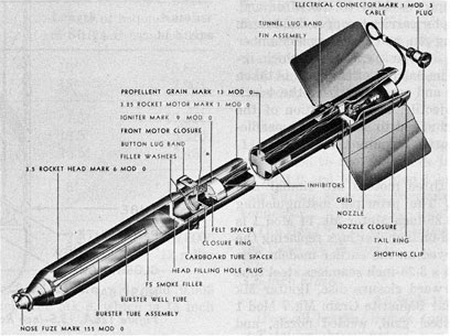 3.5-inch Mks 6 and 9: The head is filled with F.S. or P.W.P. smoke. The Mk 9, the initial California Institute of Technology production, was not issued. The Bureau of Ord-nance, in adopting this head, increased the length 1-½ inches and issued the round as the Mk 6. |