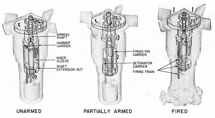 The fuze is now fully armed. On impact, the entire upper assembly of the fuze is for-ced inward. The shear wire in the arming shaft is cut as the upper part of the shaft te-lescopes into the lower part, and the shear wire through the firing pin into the detonator. The detonator sets off the auxiliary booster lead-in, booster lead-in, booster, and main charge successively. |