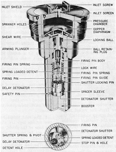 Mk 159: The Base Fuze Mk 159 is similar to the Mk 157, except that the delay time has been changed to 0.015 second. The fuze is used in the base of the 5.0-inch Rocket (5.0-inch Motor - Head Mks 5 and 6). Other minor structural changes have been made as follows: (1) a slightly heavier shear wire is used; (2) the inlet screen and inlet washer have been replaced by a brass washer having one side flat and the other radially serrat-ed (the radially serrated side faces the fuze head, so that the motor gases can enter the fuze diaphragm chamber); (3) the number of external threads on the body has been in-creased and "run out" just below the flange to afford a snug fit for the sealing washer, and (4) the fuze has been completely waterproofed. The Base Fuze Mk 159 is shipped to the field installed in the base of the rocket head. |
