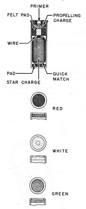 Description: The cartridge, sometimes called the Very signal, is similar in appearance to a 10-gauge shotgun shell. The star charge is a tightly-packed cylinder of pyrotechnic material reinforced with wire and wrapped with quick match. The propelling charge is composed about 25 grains of black powder separated from the star charge by a hard felt pad. |
