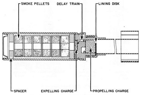 Description and operation: The signal is launched in the same manner as the M17A1 series. The fuze delay ignites an expelling charge, which expels and ignites the six smoke pellets at an altitude of 600 feet. The pellets burn and fall, leaving a colored smoke trail. |