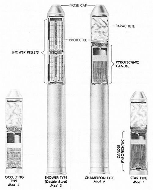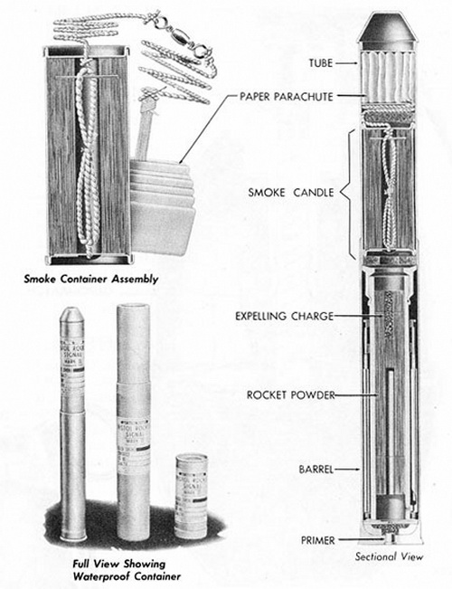 Operation: The signals are fired from the Submarine Rocket Pistol Mk 1 Mod 0 or the Pyrotechnic Pistol AN-M8. The primer ignites the one-gram auxiliary expelling charge, which projects the upper section of the signal to a height of 30 feet, where the rocket powder ignites, sending the signal on up to 650 feet. There the pyrotechnic element-chameleon or smoke-ignites. As the signal leaves the projector or pistol, the spring-loa-ded vanes fold out into place, stabilizing the flight of the signal. |