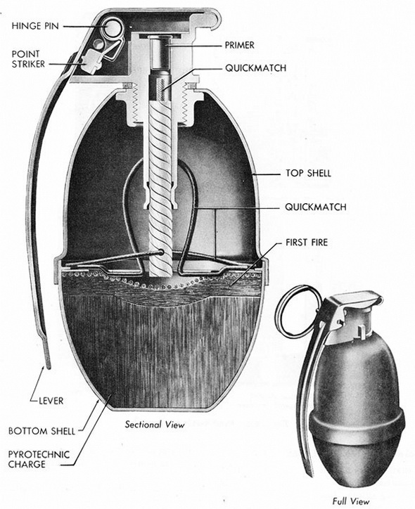 Operation: Pull the release pin and throw the grenade. When the lever is released, the firing pin is freed to fire the primer. The primer ignites the delay fuse, which burns for seven seconds and then ignites the ignition charge. The ignition charge sets off the first fire composition. The gases from the ignition charge and first fire force the two shells apart, thus leaving the illuminant composition of the bottom shell free for burning. |