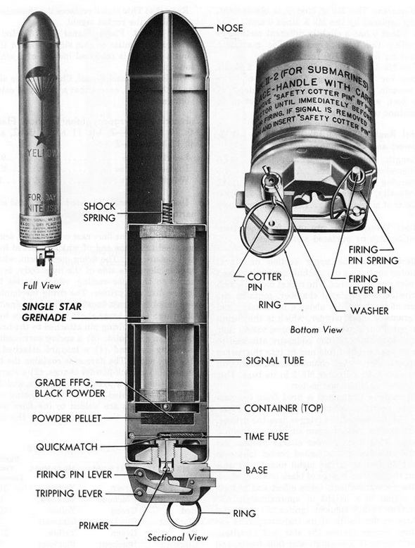 Description: The signal consists of a cylindrical aluminum case containing the grena-de-type Pyrotechnic Candle Mk 3. The bottom end contains two delay elements. A sing-le-star candle is attached to a parachute by an asbestos cord. |