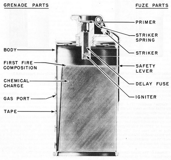 Operation: When the safety pin is removed preparatiry to throwing, the lever is held in place by the hand holding the grenade. When the grenade is thrown, the lever is re-leased. The striker, driven by its spring, throws off the lever and rotates about its pivot to strike the primer. The primer ignites the delay element, which takes about two se-conds to burn through to the igniter. The igniter ignites the starter mixture, which crea-tes enough heat to vaporize the chemical ingredients. The pieces of adhesive tape co-vering the gas ports are blown of burned off and gas is emitted. The gas generation rea-ches full volume three seconds after the safety lever is released, and gas is emitted for from 20 to 60 seconds. The M7A1 has an average burning time of 45 seconds. |