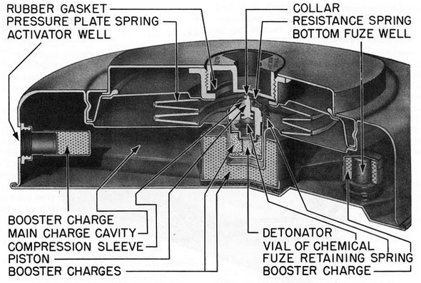 When pressure is applied on the pressure plate, it is transmitted to the piston head. As the resistance of the spring is overcome, the compression sleeve is crushed, and the piston moves down to crush the vial of chemical. The chemical reacts with the surround-ing mixture to set off the detonator, fuze booster, booster, and main charge. |