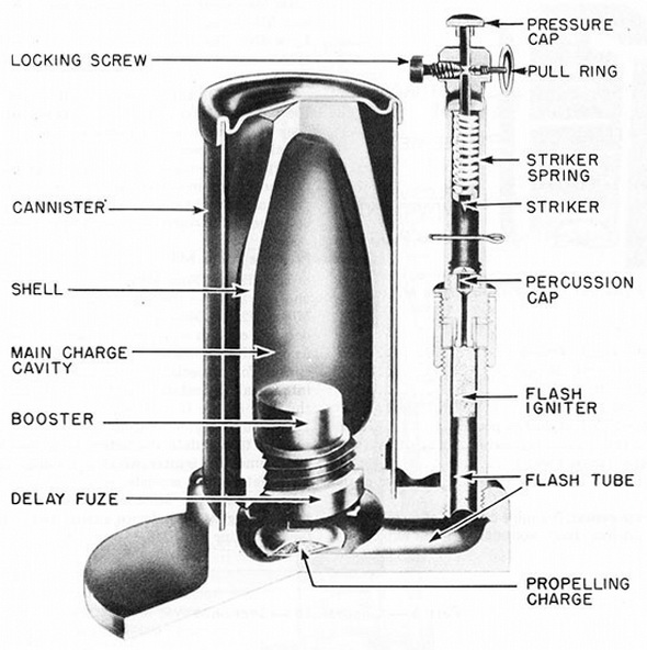 Operation: The mine is similar to a small mortar. When the fuze is actuated, the pri-mer sets off the igniter. The flash from the igniter sets off the propelling charge in the base plate. The propelling charge projects the shell into the air and at the same time ig-nites the delay fuse in the base of the shell. When the shell is at a height of approxima-tely six feet above the base plate, the delay fuse fires a tetryl booster, which detonates the main charge. The effective lethal range of the shell is 60 feet. |