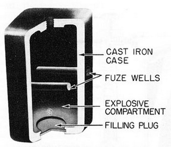 Components: The mine consists of a rectangular cast-iron body containing high ex-plosive, with fuze wells on two opposite sides and one end. The filling hole on the other end is closed by a disc. The mine is activated by the Fuze M7A1. |