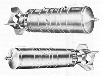 The cluster adapter consists of a thin metal case with a channel bar extending through the center, and a standard tail fin fixed to the after end plate by means of a single heavy bolt. At the forward end, a rounded nose fairing is fastened to the forward end plate. From the fuze seat, a length of primacord extends through a thin metal tube to the after end of the adpater. The adapter is equipped with three suspension lugs, the center lug added for use in British planes. When the cluster adapter is loaded, the bombs are packed around the channel bar and the assembly is held in place by nine metal straps. |