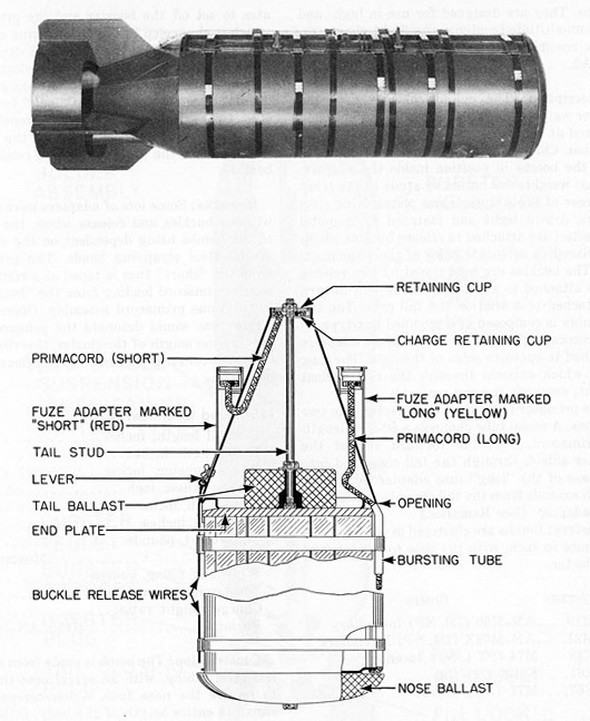 Operation: On release, the arming wires are withdrawn and the two fuzes arm. Upon expiration of the time setting, the "short" fuze operates to set off the booster and the primacord which is channeled to the fin-retaining cup. The cone is blown off by the pri-macord detonation, thereby withdrawing the buckle release wires and opening the clus-ter. Upon failure of the "short" fuze to function, the "long" fuze operates two seconds later. This detonates the primacord extending the length of the cluster, which shears the steel straps and releases the bombs. |