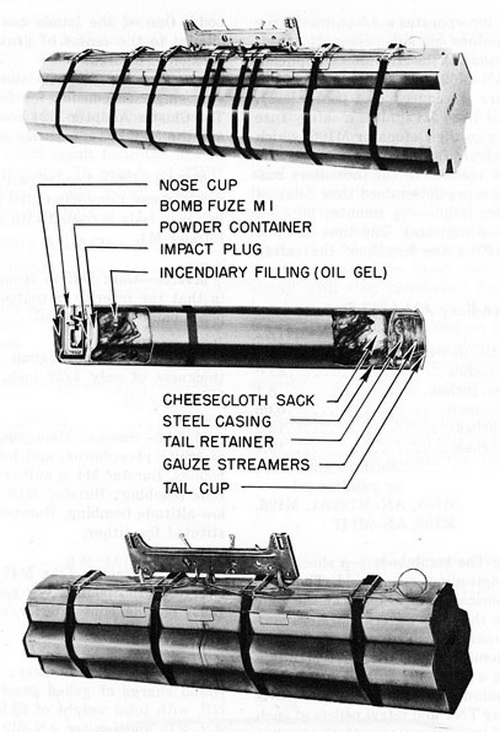 Construction: The bomb body is a hexagonal case with a nose cup welded to the forward end. The nose cup, fuze and powder charges are sealed off from the rest of the case by an impact diaphragm and plug held in a cup-shaped sealing diaphragm. The in-cendiary oil filling is held in a cheesecloth sock situated between the forward sealing dia-phragm and the tail cup. |