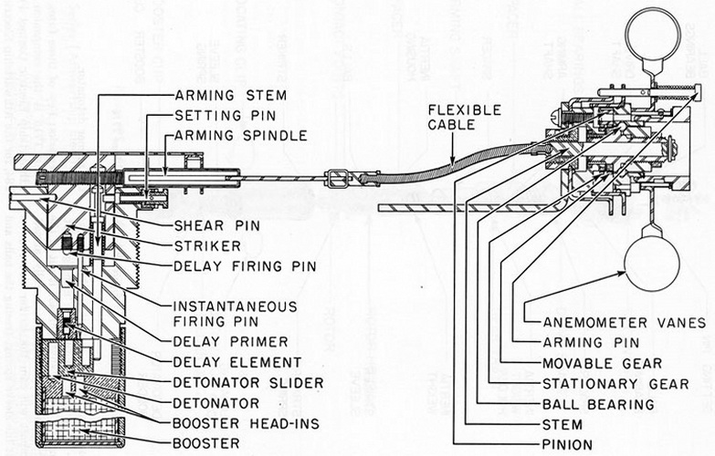 General: This is an "elbow"-shaped fuze for use in guided missiles. At present it is used only in the nose of "Felx" VB-6. It is essenitally a Nose Mechanical Impact Fuze AN-M103 connected to the remotr windmill arming vanes by a flexible cable. The vane and gear assembly is the same as that used on the Tail Mechanical Impact Fuze M167. The fuze proper is like the AN-M103, except that is does not have the vane cap, safety discs, or arming screws. |