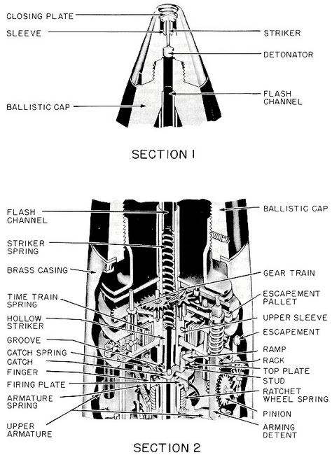 The base of the fuze supports the timing and release mechanism, which is carried by a number of plates and arranged axially around the hollow striker. The mechanism is en-closed in a brass casing held in position by a ballistic cap of bakelite, which is screwed over the top flange of the internal fuze mechanism. The forward end of the bakelite cap carries the percussion element, consisting of a striker, sleeve, and detonator. |