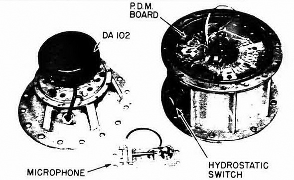 The microphone button is fitted with a small leak-holse leading from the inside of the microphone pot to the carbon granule chamber. By this arrangement, the microphone diaphragm is exposed to the water, but, since the hydrostatic pressure is equalized by compression of the air within the rubber bag, there is no loading of the carbin granules and the sensitivity of the microphone remains unaffected. |