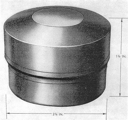 a. Description. The antipersonnel plastic-can mine (fig. 118) is a copy of the British tire-burster or "ointment box" mine. It is 2 3/8 inches in diameter and 1 5/8 inches high. A small, black, cylindrical bakelite case with an overlapping lid houses a doughnut-shaped main charge, a built-in spring-loaded striker held by a shear wire, and a threaded percus-sion-cap-and-detonator assembly. The pressure lid is held to the case by adhesive tape. This mine weighs 4 ounces, including 2.5 oun-ces of explosive. |
