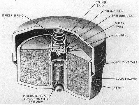 Further pressure causes the pressure disk to shear the shear wire, releasing the spring-loaded striker against the percussion-cap-and-detonator assembly and firing the main charge. |