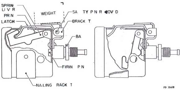 b. Functioning. In order to remove the safety pin, a weight of at least 2 pounds must be applied to the exposed surface of the latch. After the safety pin is removed, the re-moval of the load on the latch automatically frees the spring lever which, propelled by the spring, swings through and strikes the firing pin at the end of its flight, firing the percussion cap and detonating a nonelectric cap crimped to the base. |
