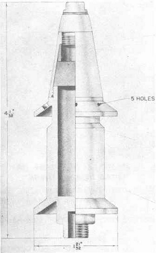 PROJECTILE: 4.031 inches, over-all length with fuze. 1.125 inches, diameter of body midway. 1.656 inches, diameter of base. 9.87 ounces total weight. 0.98 ounce, weigt of bursting charge. Cyclonite/Wax (90/10), type of bursting charge. |