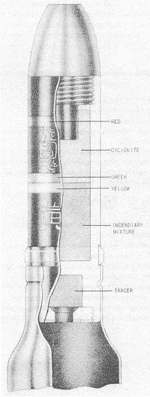 Remarks: The projectile is made of steel. A brass nose piece filled with P.E.T.N. threads into the incendiary filled projectile. Detonation of the projectile is accompished by the crushing action of the P.E.T.N. filled nose piece. |