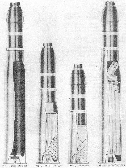 ** The cases for the type 97 and type 1 antitank guns can be distinguished by the fact that the type 97 is almost straight, whereas the type 1 has a pronounced neck. The type 1 tank and type 1 antitank guns use the same case. |