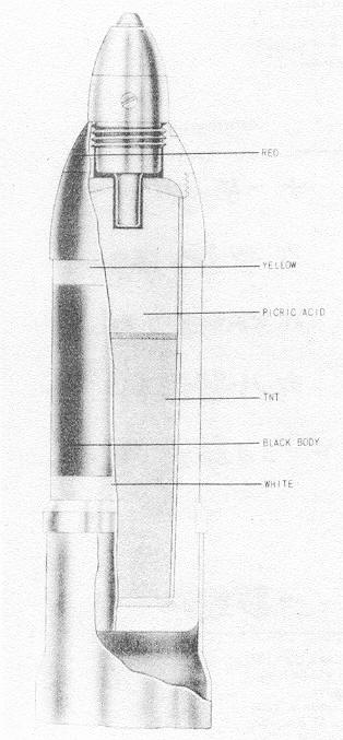 Remarks: This steel projectile is filled with TNT and picric acid. The after two-thirds of the projectile cavity is filled with high grade cast TNT. The forward one-third of the pro-jectile cavity is filled with picric acid. The entire bursting charge is enclosed in a heavy waxed paper casing with a double thickness between the TNT and picric acid charge. |