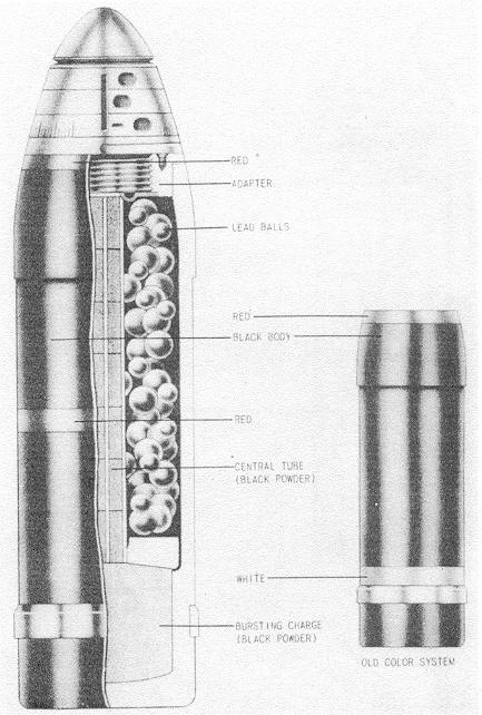 Shrapnel filled: Approximately 272 lead balls (10.5 grams each) packed in a rosin matrix. The balls are separated from the bursting charge in the base by a steel disc which rests on a shoulder in the projectile cavity.