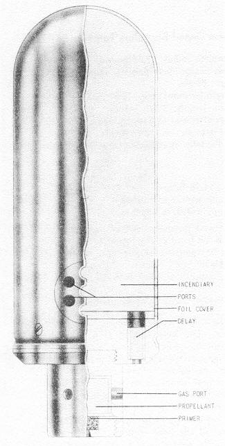 Operation: The flash from the propellant ignites the delay trains in the base of the shell, which in turn ignites the incendiary filling. |