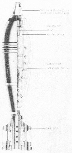Incendiary filling: Phosphorus, carbon disulphide, and 40 cylindrical rubber pellets.