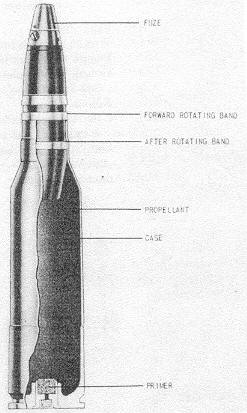 Case: The case is rimless; has a slight taper and a pronounced neck, which is crimped over the after rotating band of the projectiles. |