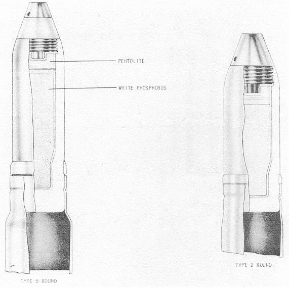 Remarks: The one-piece projectile contains only one cavity. The H.E. is surrounded by a cardboard below which is contained the W.P. in a metal canister. |