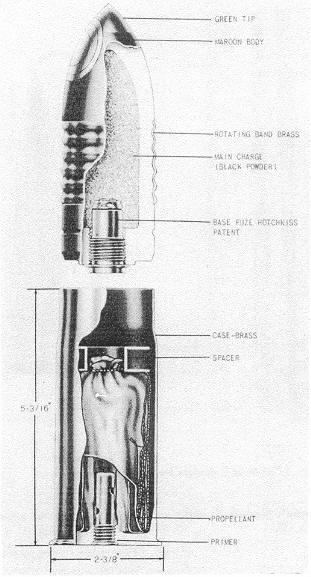 Fuzing: Hotchkiss patent fuze, screwed (R.H.) into base; a simple setback arming base fuze presumably of British manufacture. The base of the fuze is stamped "Hotchkiss Pa-tent DOC." Weight of fuze, 2 ounces. |