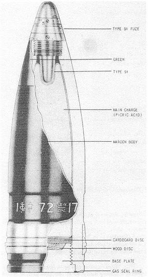 Projectile: Weight of filling projectile (without fuze): 48.42 pounds. |