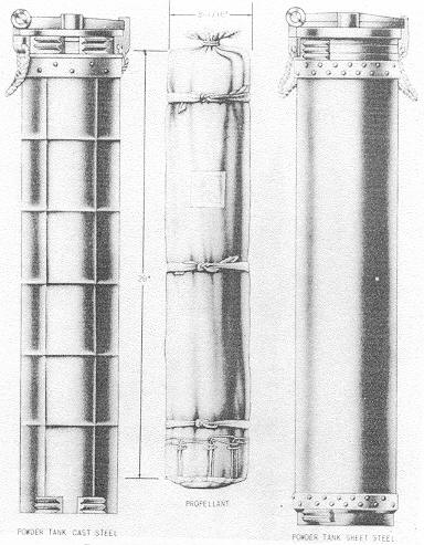 For storage purposes, the propellant charges are sealed in waterproof containers comm-only known as "powder tanks". Two types of the tanks have been recovered: one is a heavy tank (26.4 pounds) of cast steel and bronze; the other is sheet steel and alumi-num and weighs 15.4 pounds. Both are well lacquered inside and have the same internal dimensions, 6.2 inches by 33.4 inches. |