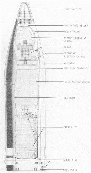 Operation: At the end of the time set, the mechanical time fuze fires the initiating pel-let. The relay train transmits the flash to the base of the primary ejection charge contai-ner and ignites the charge. The primary ejection charge expels the canister containing the illuminating charge and its parachute, and also ignites the delay element. A short time after the canister is ejected from the projectile body, the delay element fires the secondary ejection charge which expels the illuminating charge and parachutes and igni-tes the illuminant. Two parachutes, a large one above a small one, suspend the illuminat-ing unit. |