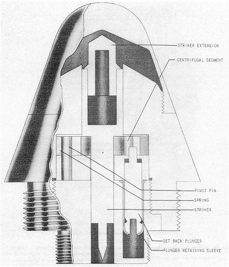 Operation: Centrifugal force causes the arming cams to move out against the pressure of the flat spring from under the striker shoulder. The nose cap is crushed on impact, and the striker driven against the gaine. |
