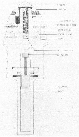 Operation: As the round feeds into the gun, a rack engages the teeth of the lower time ring, which is rotated about its axis by the meshing of these gears, setting the fuze. When the gun is fired, the force of set-back causes the striker to pierce the primer. The flash from the primer passes to the upper time ring, and in turn, to the lower. The flash from the lower time ring sets off the relay pellet and the black powder, which flashes down to the gaine. |