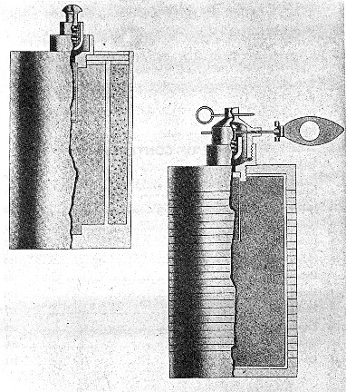 Type Mtr: The bomb consists of two cylinders of sheet metal. The inner cylinder contains the explosives, and the cylinder is threaded at the top to take a screwed circular cover. Between the two cylinder are small steel pellets embedded in concrete. |