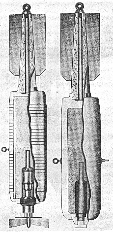 Type II: The body is one-piece machined steel with the nose threaded to receive the fuze, and the base recessed with an extension rod for the tail assembly. In all other res-pects this type is similar to Type I. |