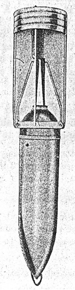 The bomb is thick-walled with a steel body and nose cast in one piece, to which a dome-shaped base is attached. Sheet metal tail fins are attached to a metal band, clamped around the body. |