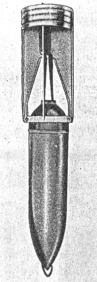 The bomb is thick-walled, with a steel body and nose cast in one piece, to which a dome-shaped base is attached. Sheet-metal tail fins are attached to a metal band clam-ped around the body. |