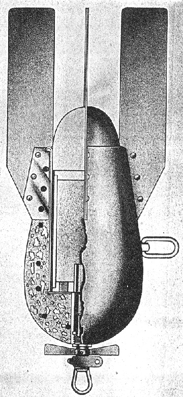 The body consists of a thin metal cylinder liner and outer concrete bomb body, which is reinforced with sheet pellets and wire. The body liner has welded to it: (1) the suspen-sion-lug socket which is internally threaded to receive the horizontal suspension lug; (2) four metal vane supports which have riveted to them four aluminum-alloy vanes; (3) two pairs of diametrically opposite wire guides for the base-plug retaining wire; (4) the ends of a helical reinforcing wire, 16 S.W.G., which is coiled in three turns and passes through the holes provided in the vane support; and (5) the upper end of a second helical rein-forced wire, 8 S.W.G., which is coiled in five turns and welded at its other end to the fuze pocket. The body-liner closing disc is drilled centrally and has pressed to it the fuze pocket. At the upper end, the liner is closed by a cork plug. This bomb is used in con-junction with chemical bombs. The purpose is to indicate the force and direction of the wind at ground level. Two main fillings are used, a smoke filling for use in the day-time, and an incendiary filling for use at night. The night filling is the 1-kg in-cendiary Bomb Type II. Another modification of this bomb has no body liner but is all concrete and is used for practice. |